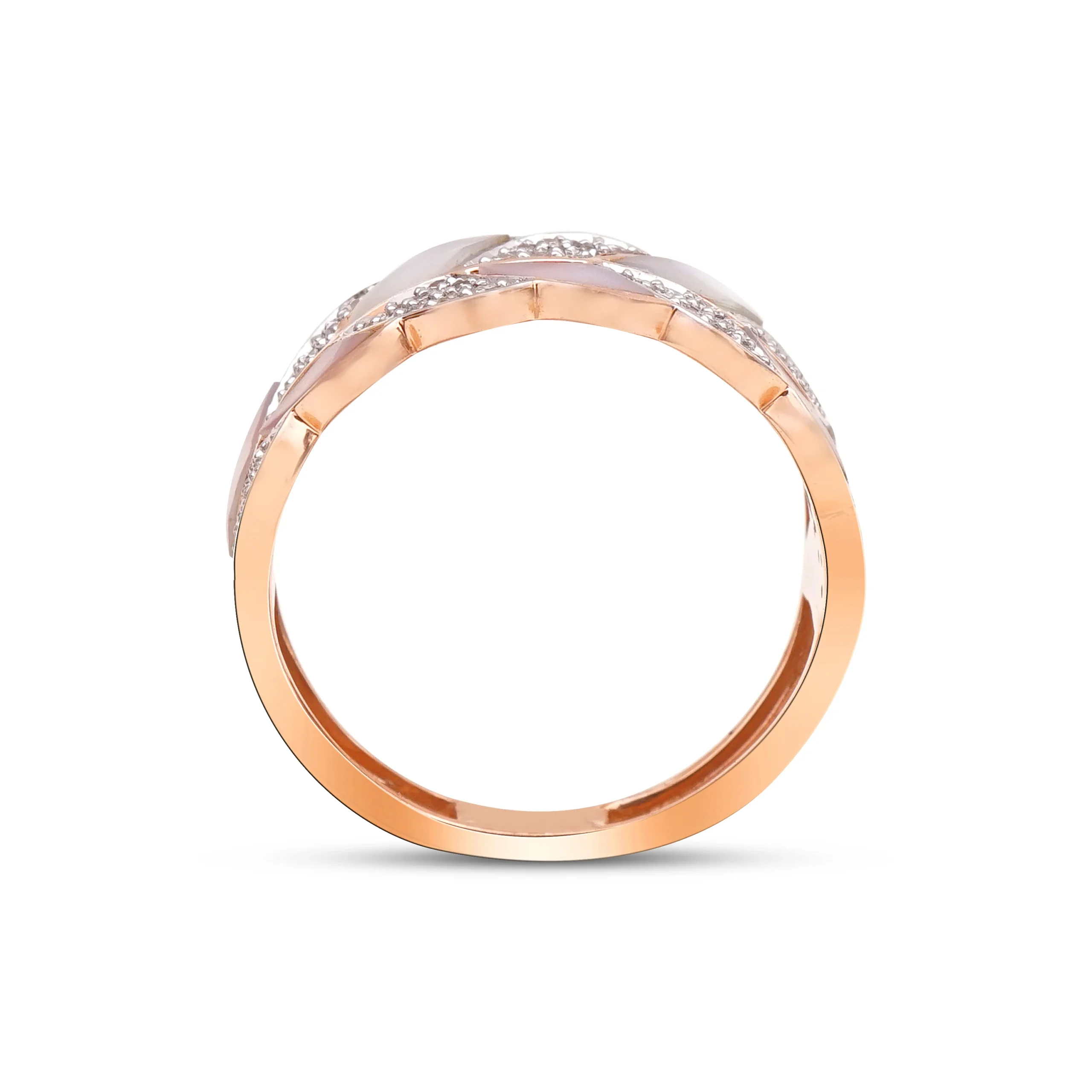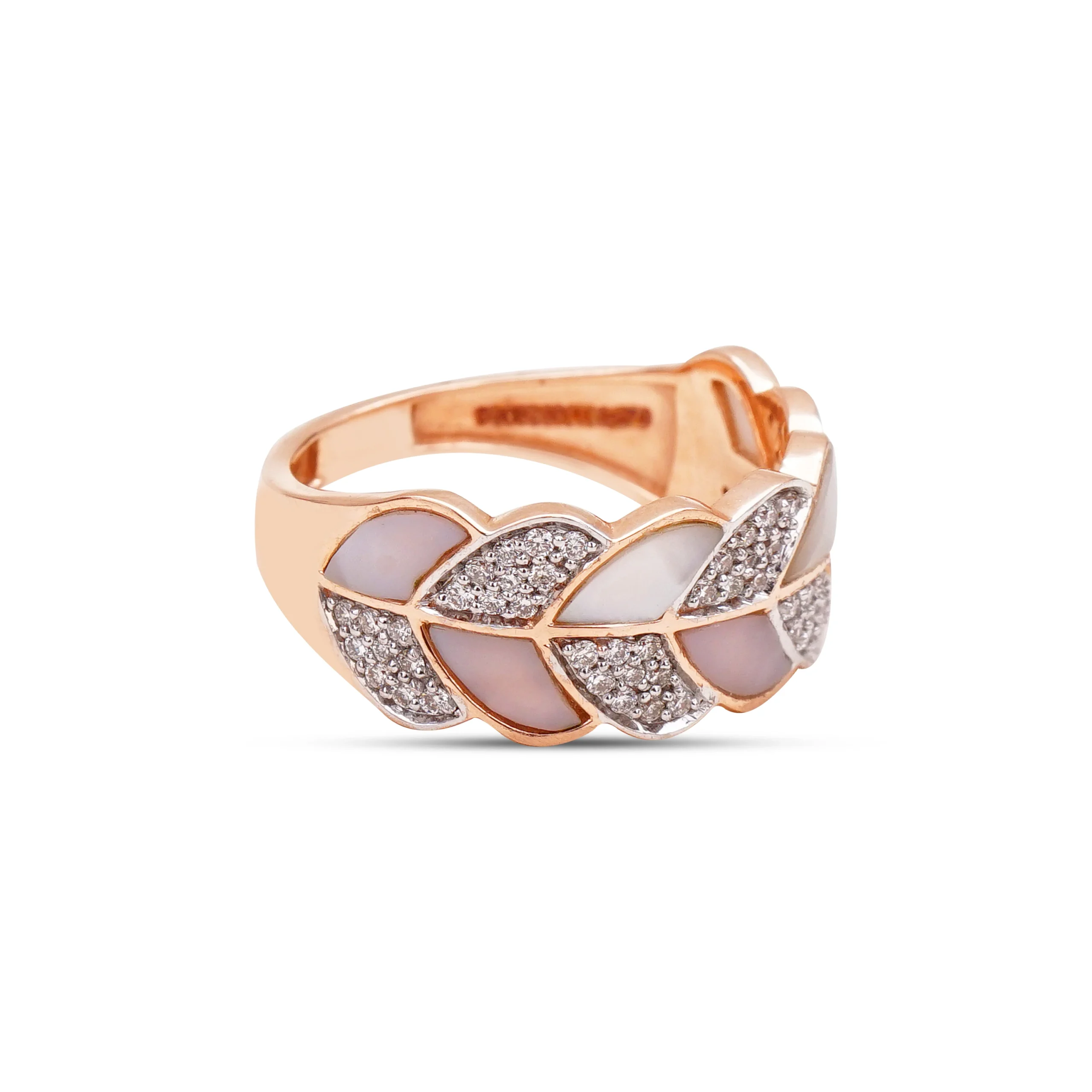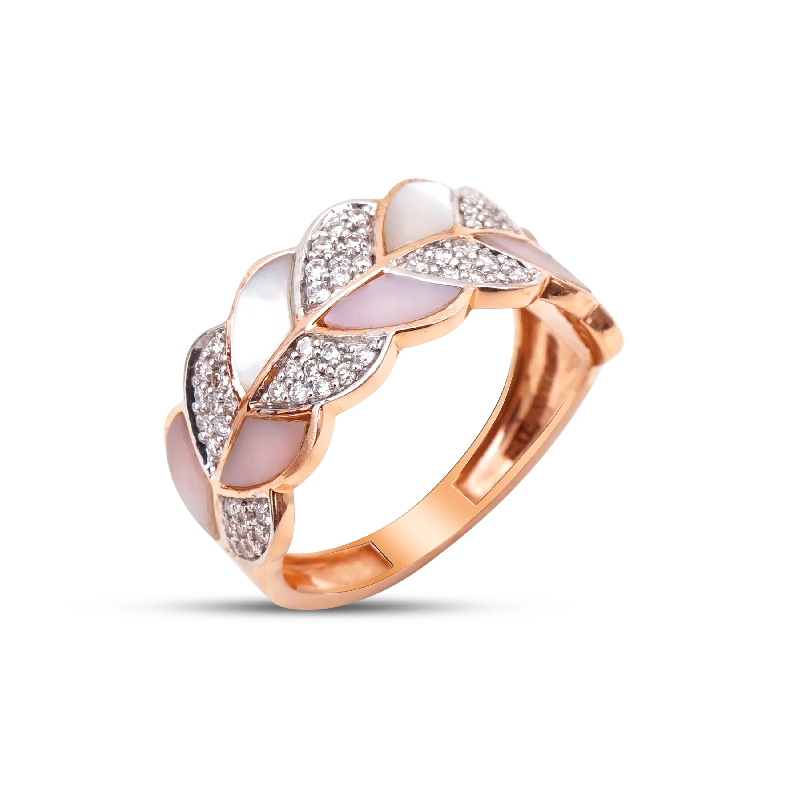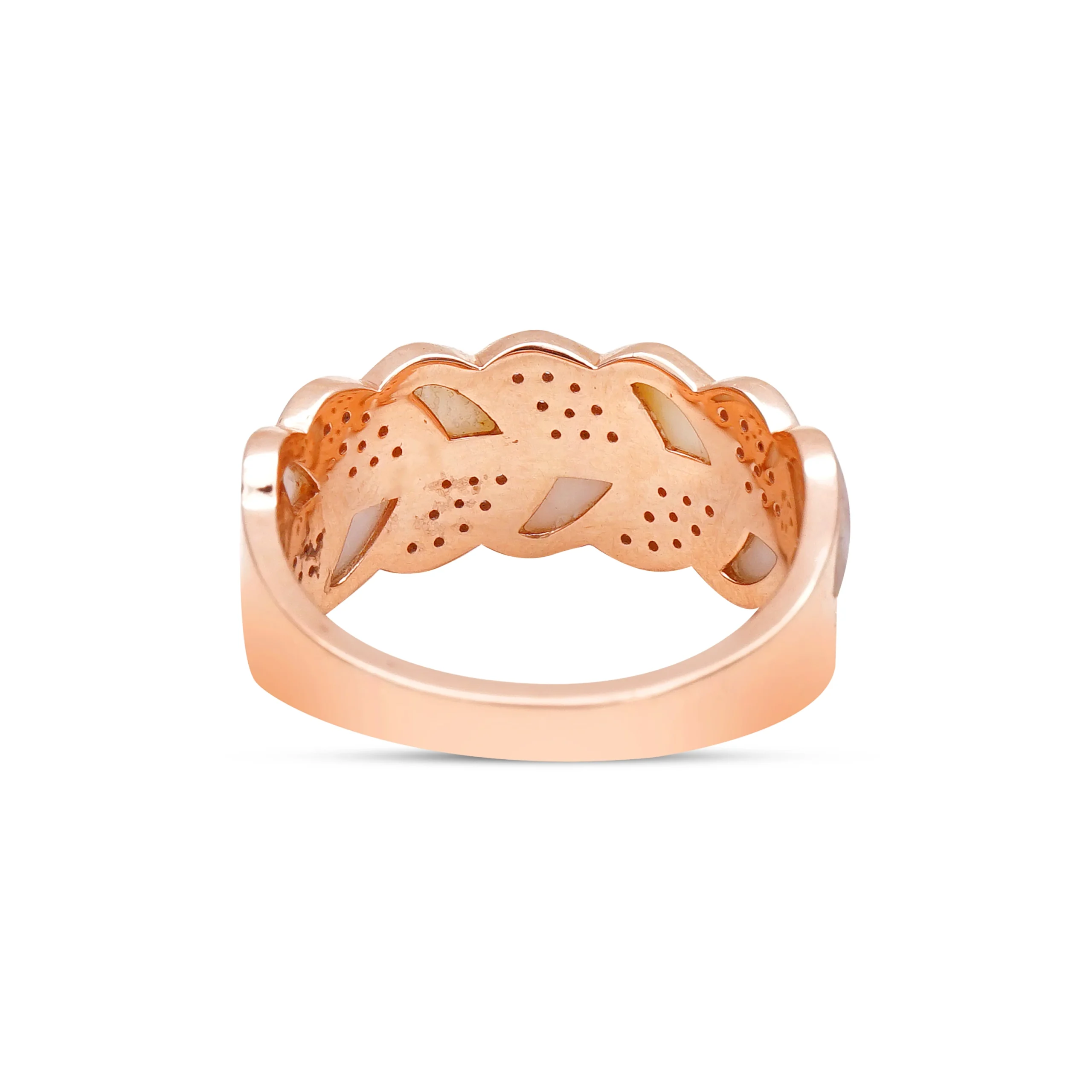 A perfect blend of pavé-set natural diamonds, rose gold, and custom-cut mother-of-pearl stones. Available in both ring and infinity band formats, this piece is the ideal accessory for your ivory and pastel attires.