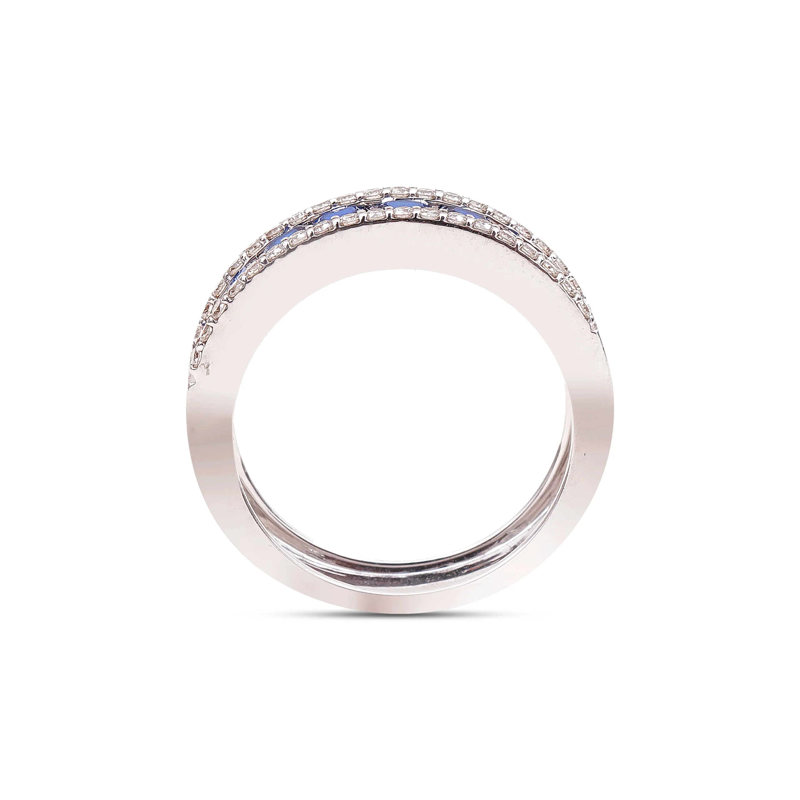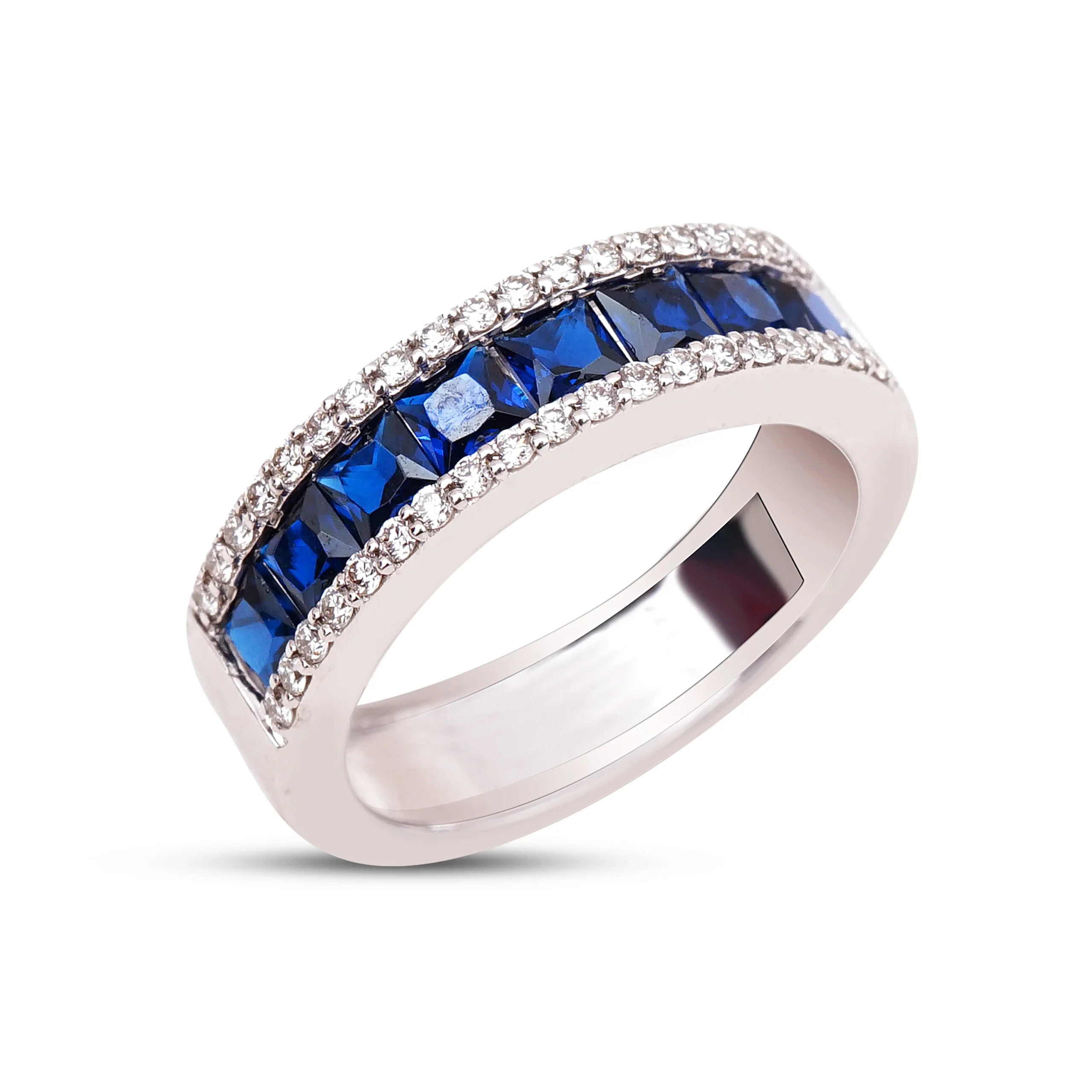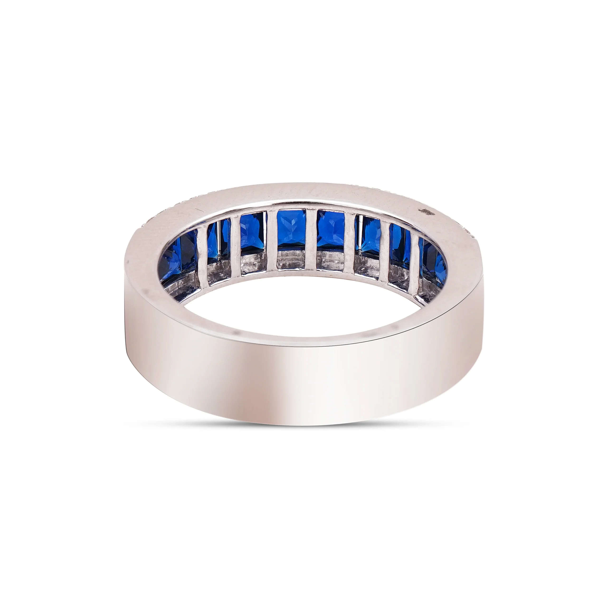 This sleek diamond band features a line of channel-set blue crystals, flanked by prong-set diamonds on either side. The band is customisable with a wide range of crystal colours.
