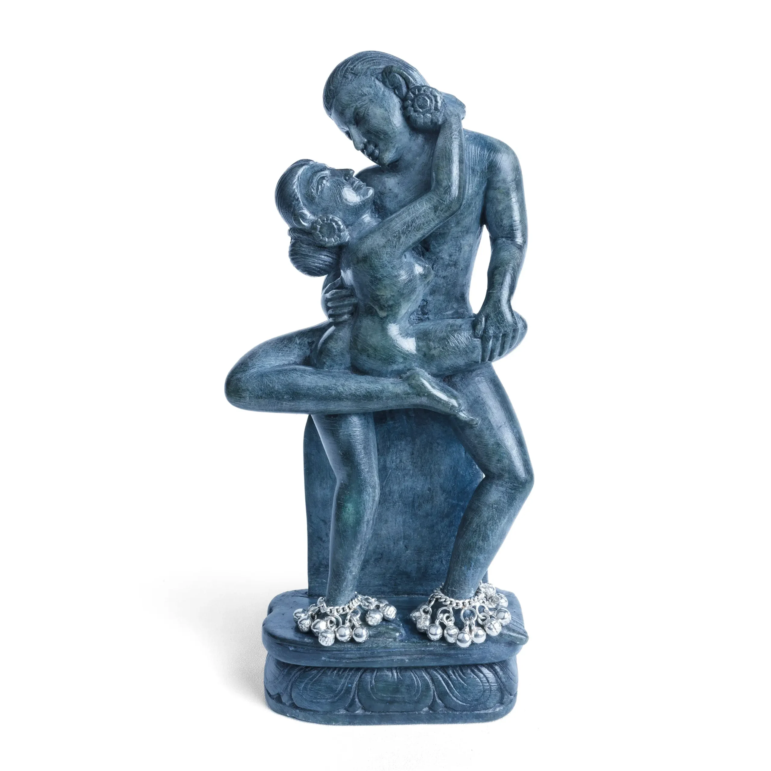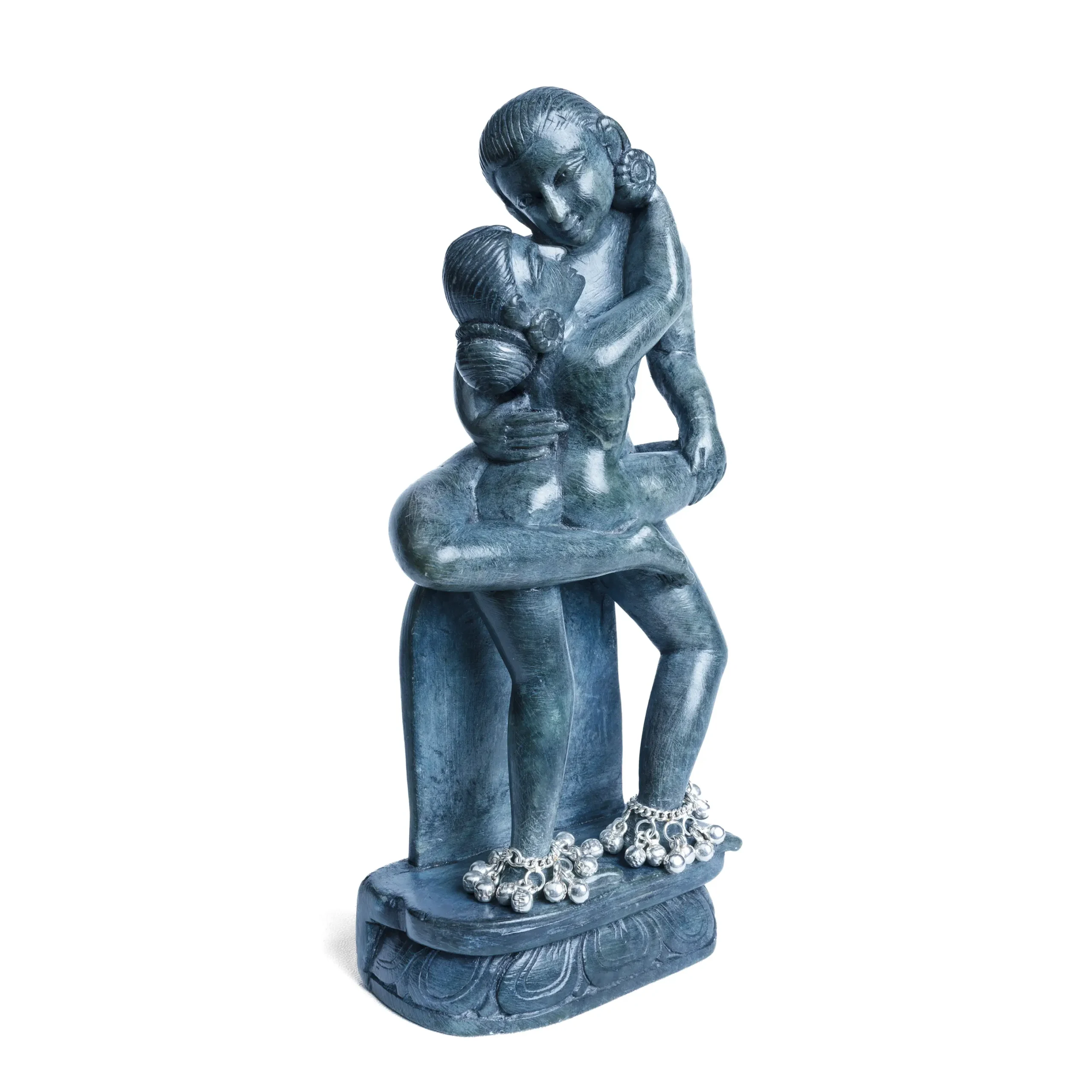 Sin I is an enchanting serpentine stone sculpture that weaves a tale of forbidden pleasure and raw sensuality in your space. Adorned with sterling silver anklets with ghungroos (bells), this exquisite piece combines the natural beauty of serpentine stone with the elegance of silver, creating a captivating focal point that exudes primal desire.